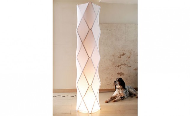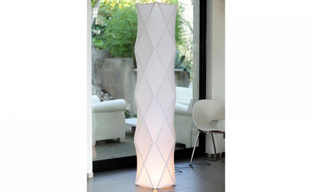 Grand luminaire d’intérieur à variateur d’intensité lumineuse. Constitué d’une housse en tissu extensible tendue sur une structure en bois de frène. Il diffuse une lumière douce et tendre, à faire varier selon l’humeur du moment, et assure une belle présence.