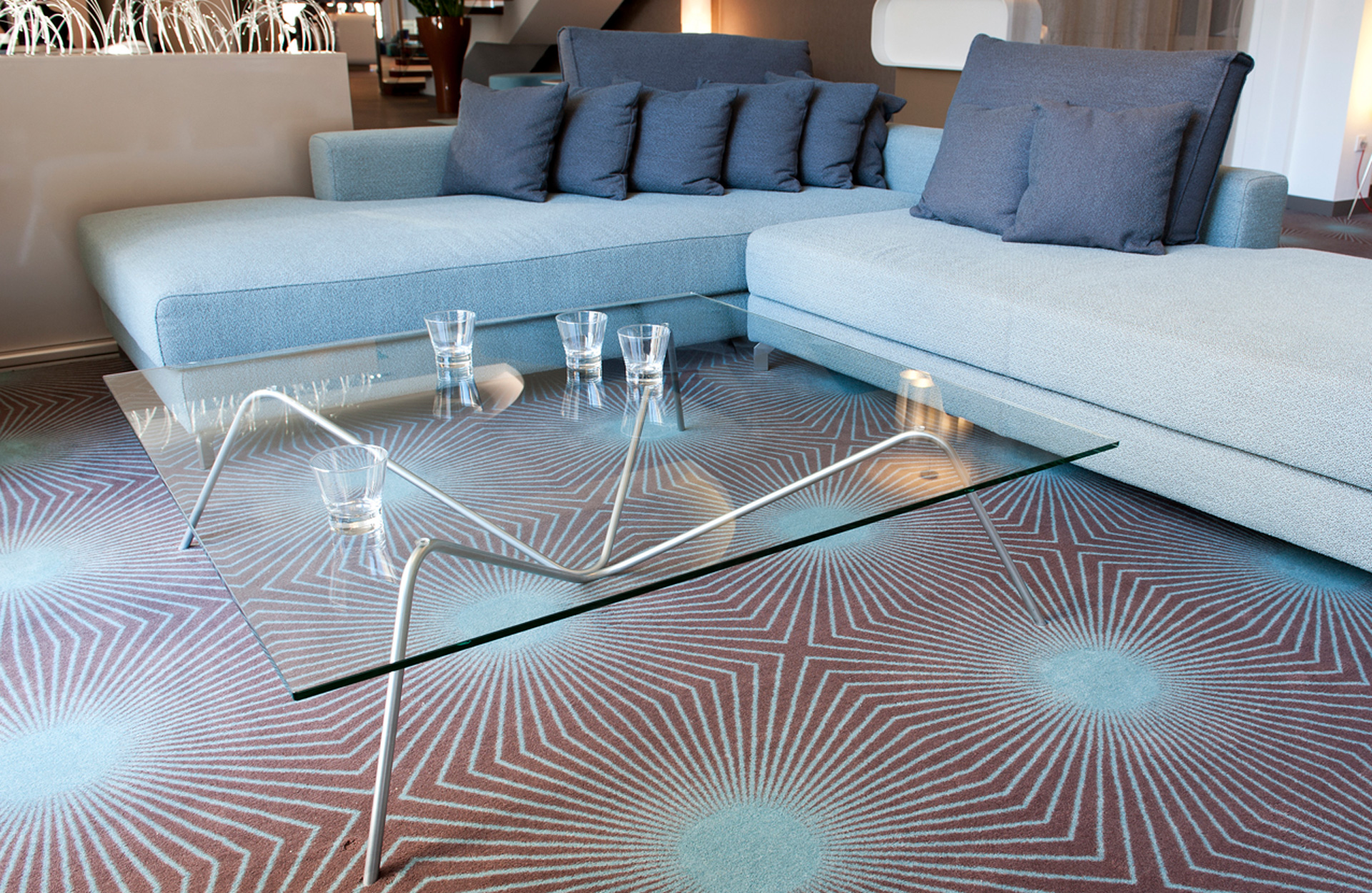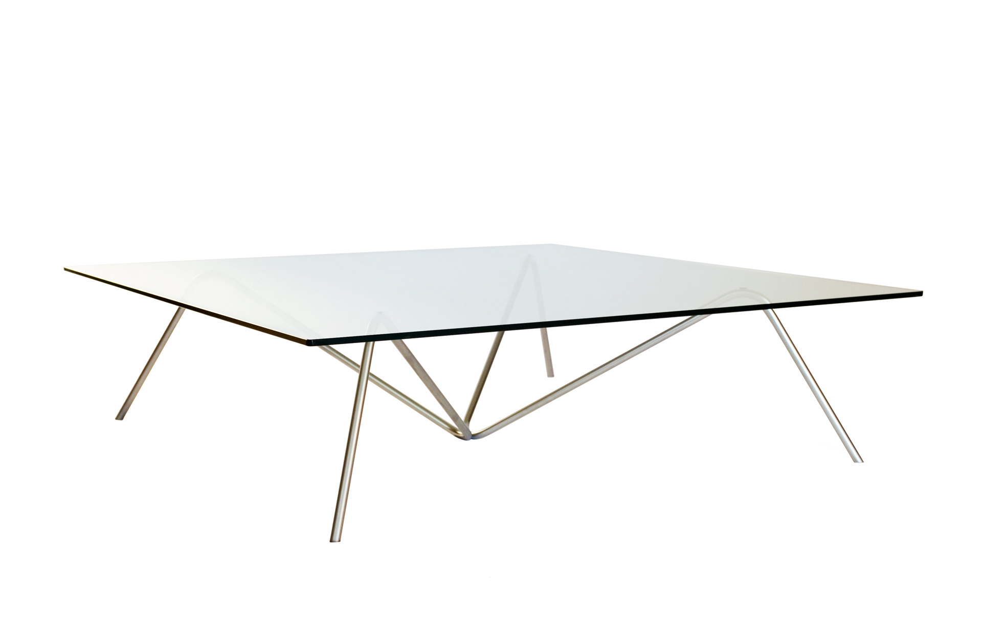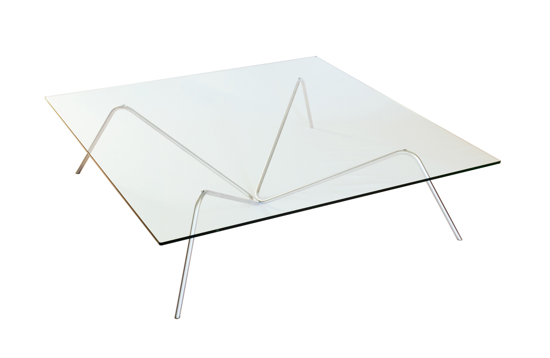 Grande table basse carrée élégante et aérienne, un modèle de simplicité. Deux pieds en barre d’acier, identiques, juxtaposés, supportent un plateau en verre.