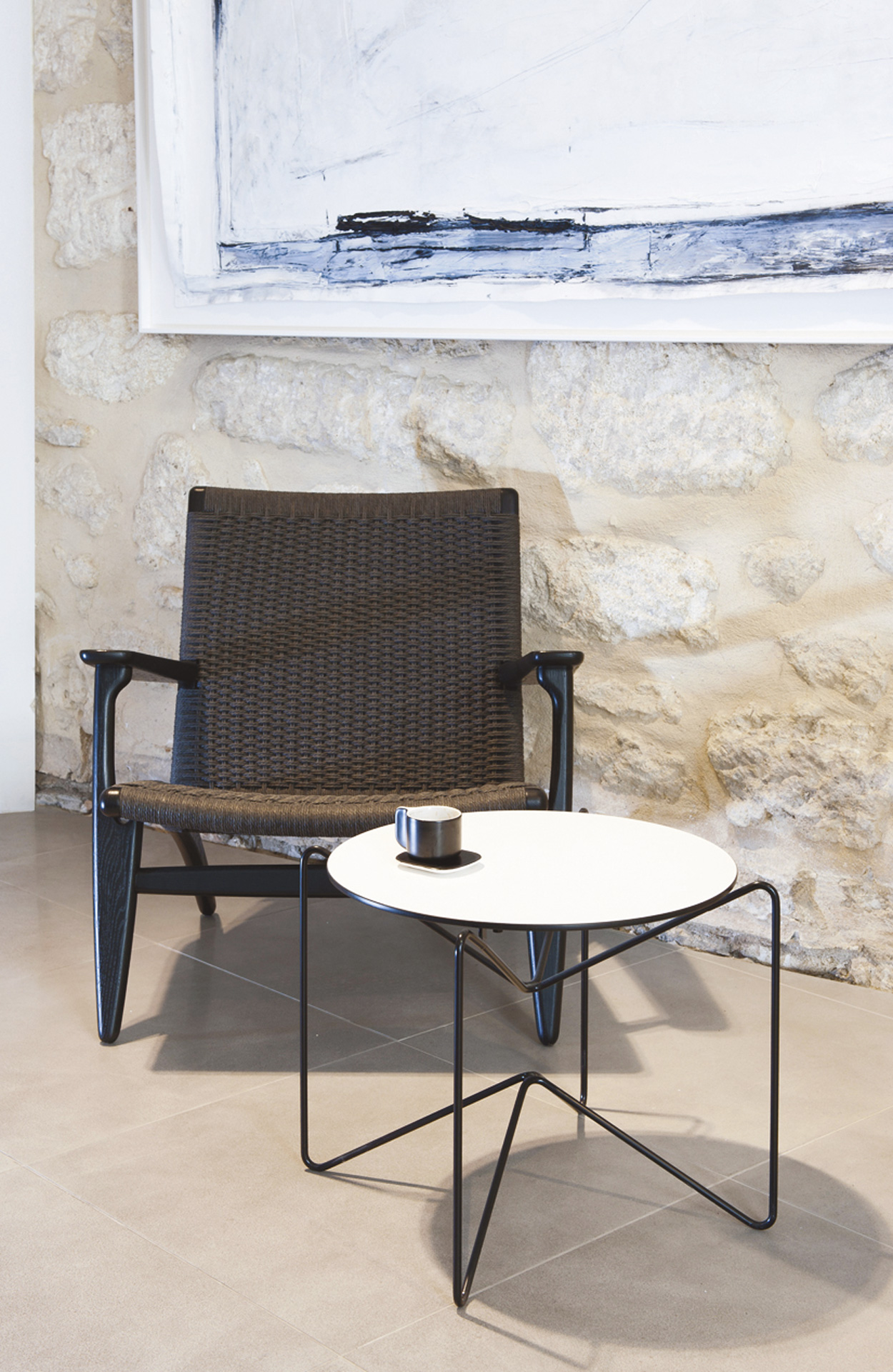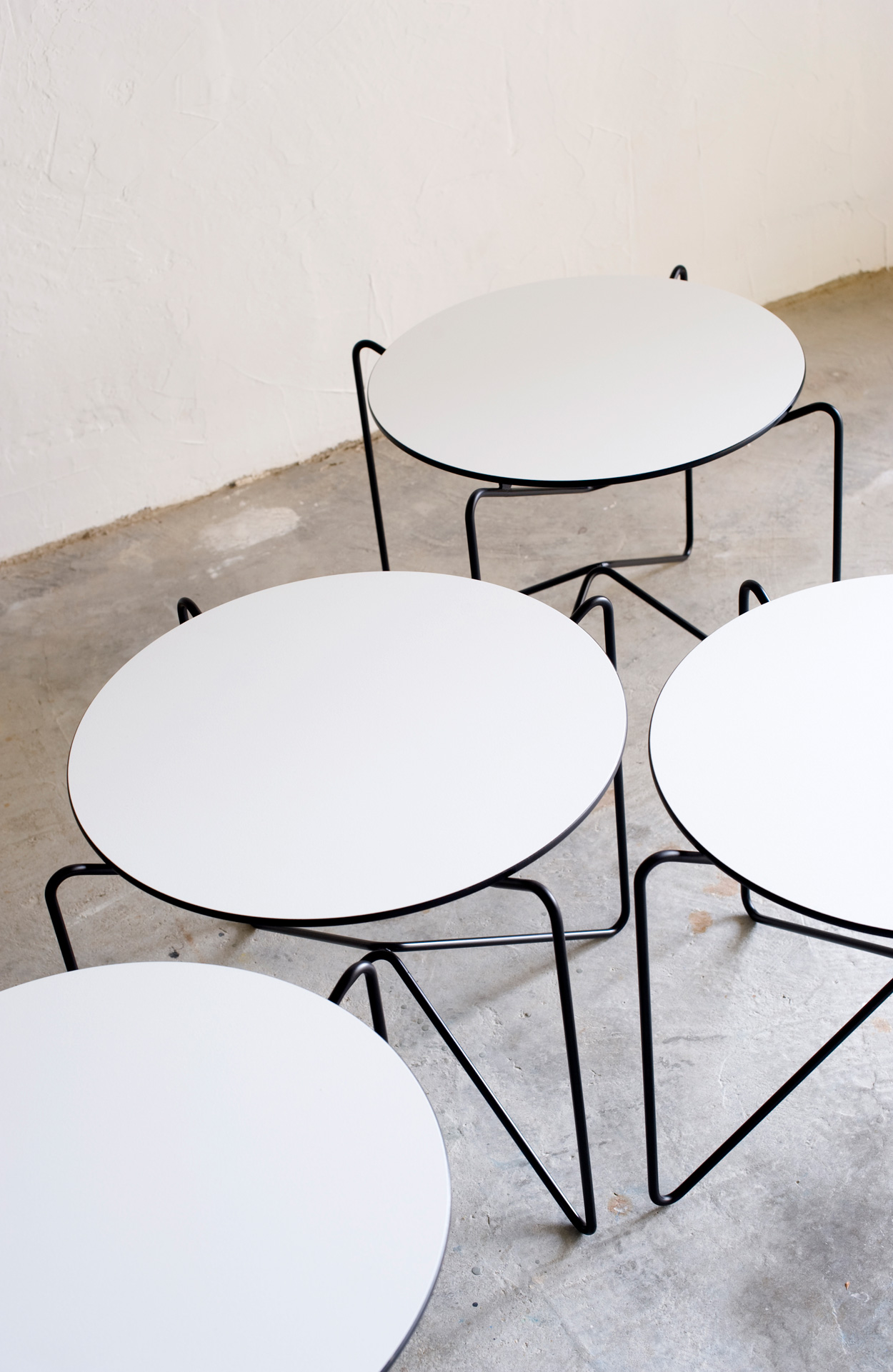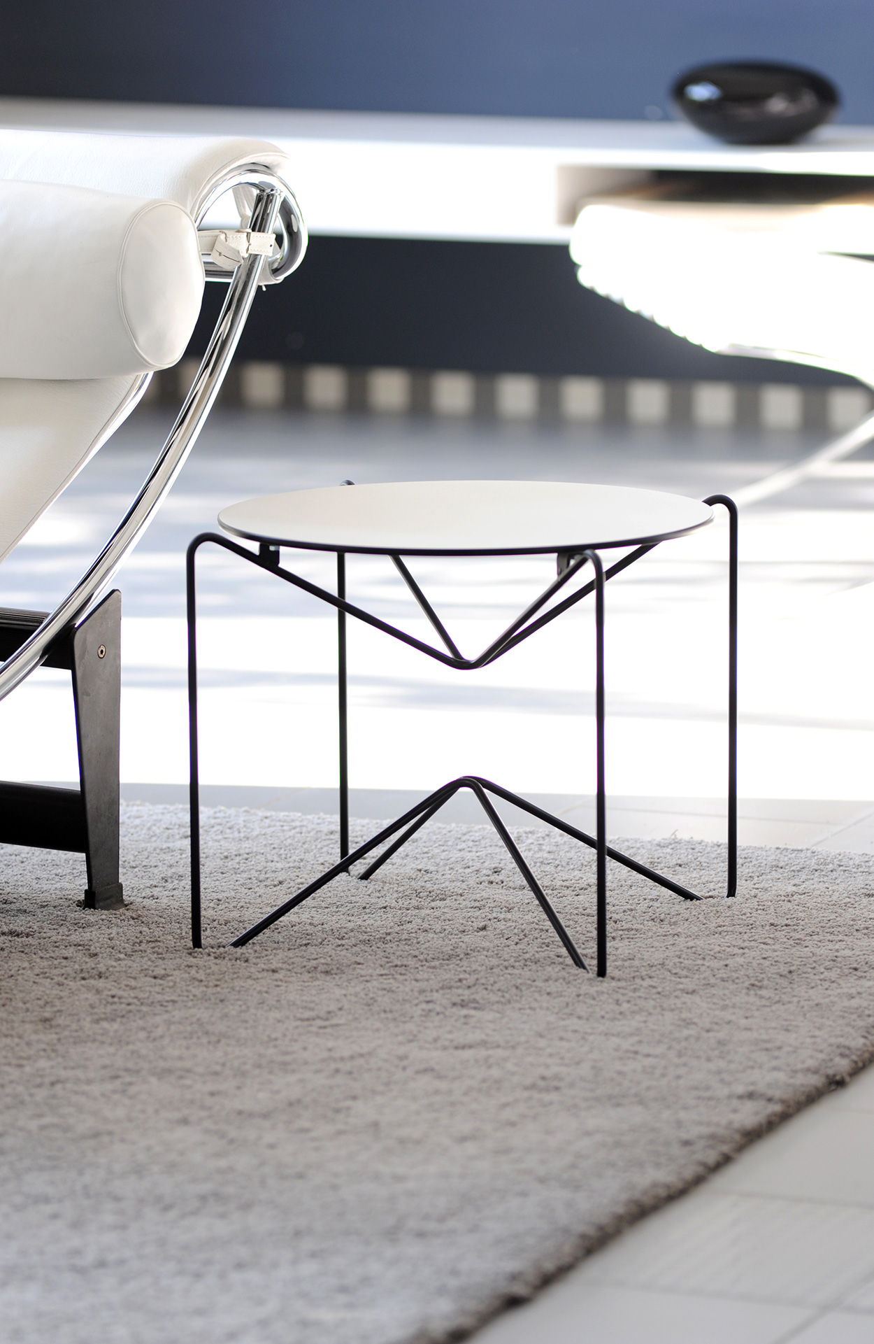 Structure en fil d’acier Ø 9mm peinture époxy mate. Plateau en stratifié compact 10mm teinté blanc uniformément dans la masse.