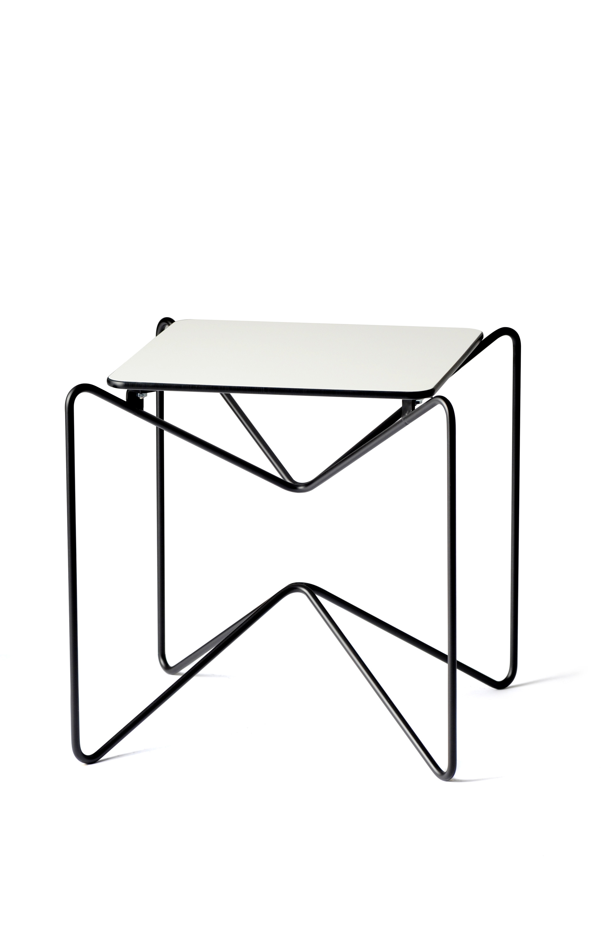 Structure en fil d’acier Ø 9mm peinture époxy mate. Plateau en stratifié compact 10mm teinté blanc uniformément dans la masse.